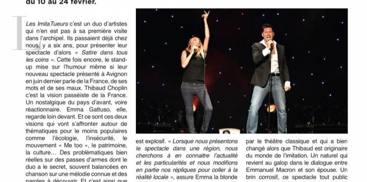 Les ImitaTueurs dans France Antilles pour une grande tournée dans les îles de Guadeloupe !Retrouvez Emma Gattuso et Thibaud Choplin au Centre Culturel Sonis, à l'auditorium Jérôme Cléry de Basse-Terre, au Centre Culturel Robert Loyson au Moule, au Casino de Saint-François et au thé...