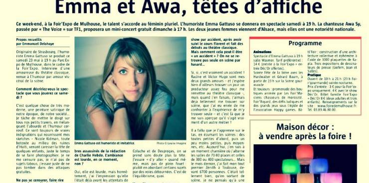 Emma Gattuso dans l'Alsace, à l'occasion de sa représentation exceptionnelle en clôture de la Foire des Expos de Mulhouse.Elle y a présenté son one woman show EMMA M'A TUER, pour la toure première fois dans son Alsace natale.