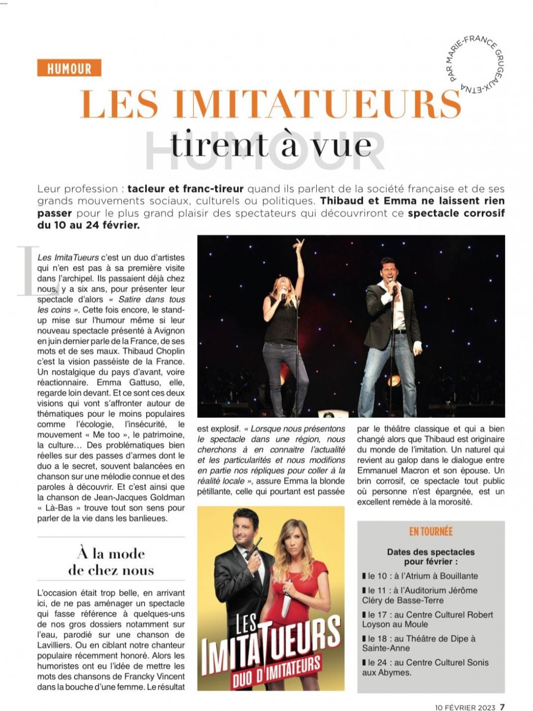 Retrouvez Emma Gattuso et Thibaud Choplin au Centre Culturel Sonis, à l'auditorium Jérôme Cléry de Basse-Terre, au Centre Culturel Robert Loyson au Moule, au Casino de Saint-François et au théâtre de Dipe à Sante-Anne... entre 2 Ti Punch !