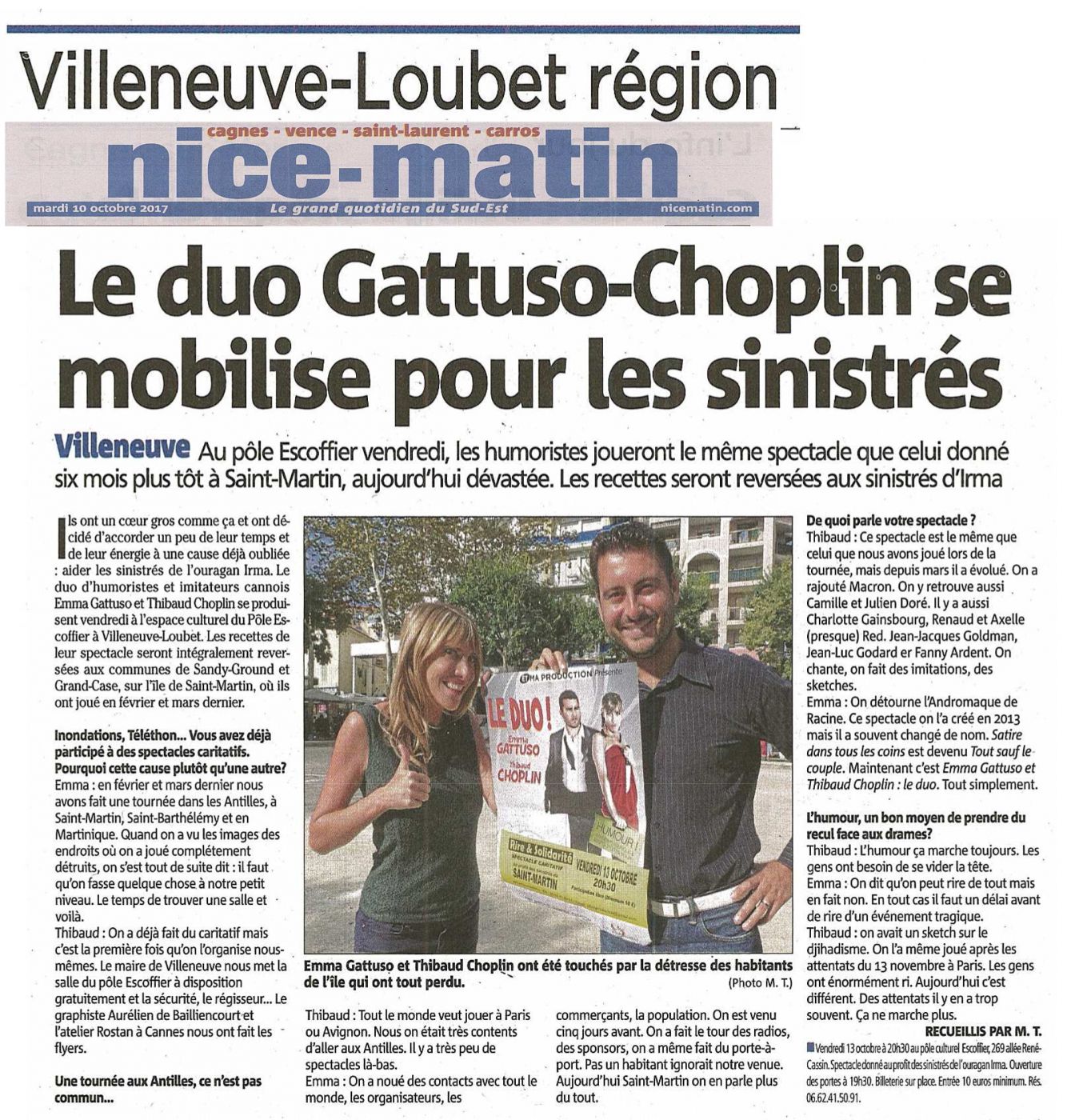 Suite au passage de l'ouragan IRMA qui a dévasté l'île de Saint-Martin, où Emma Gattuso et Thibaud Choplin s'étaient produits en spectacle quelques mois auparavant, les deux artistes se mobilisent pour organiser une grande soirée caritative pour les sinistrés, au Pôle Escoffier de Villeneuve-Louvet.