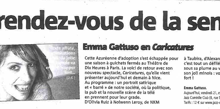 Emma Gattuso dans Nice Matin, à loccasion de son spectacle présenté au Jazz Comédy Club