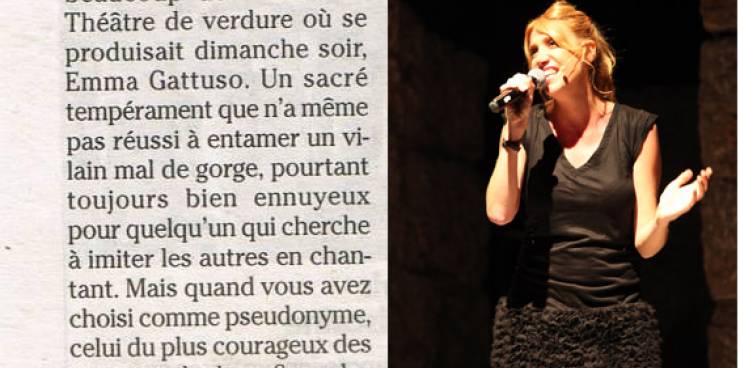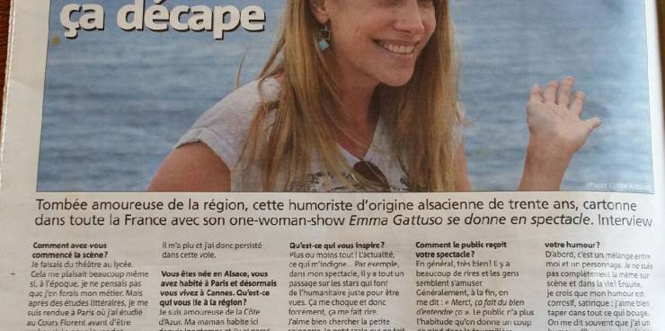 Emma Gattuso dans Var Matin, à l'occasion de la semaine du Rire de Draguignan, où elle a présenté son spectacle devant 400 personnes rassemblées dans le magnifique théâtre antique de la ville.