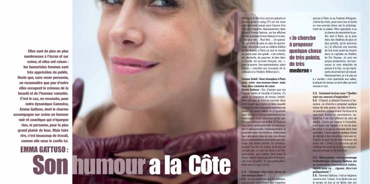 Emma Gattuso dans Théâtral Magazine.Pour la promotion de son one woman show qui s'est joué plusieurs mois à la Comédie des Boulevards à Paris.