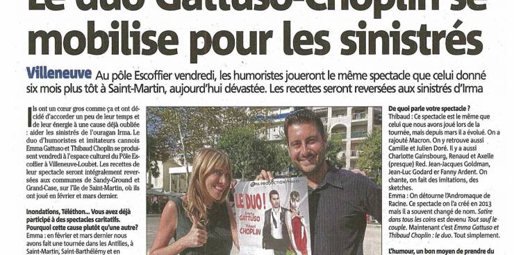 Les ImitaTueurs dans Nice MatinSuite au passage de l'ouragan IRMA qui a dévasté l'île de Saint-Martin, où Emma Gattuso et Thibaud Choplin s'étaient produits en spectacle quelques mois auparavant, les deux artistes se mobilisent pour organiser une grande soirée caritative pour les sin...